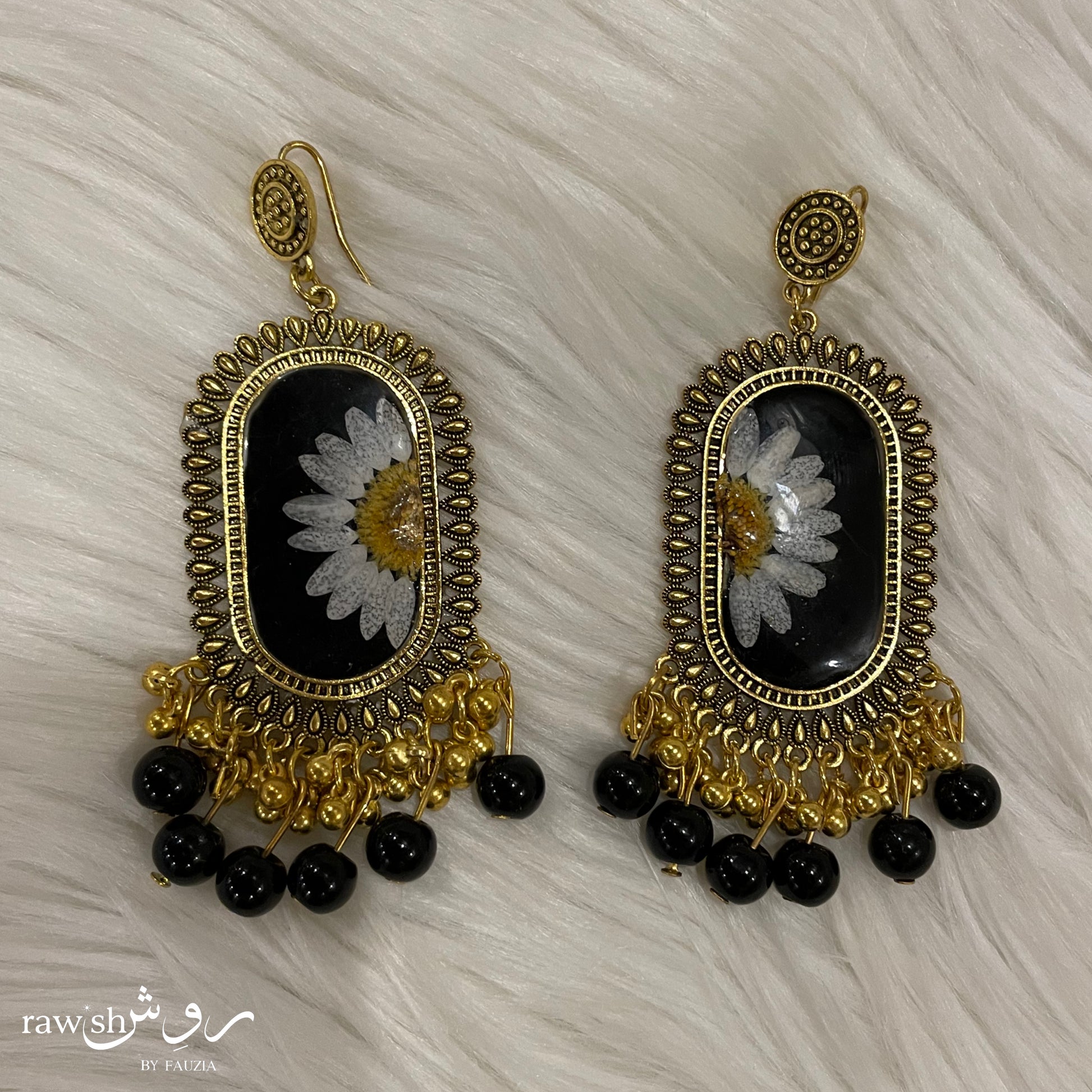 These Black Floral Oval Jhumkas feature real daisies preserved in resin, set against a timeless black background. Their elegant design adds a touch of sophistication to any outfit, ensuring you stand out and capture attention effortlessly. Perfect for elevating your style with a unique, chic accessory.
