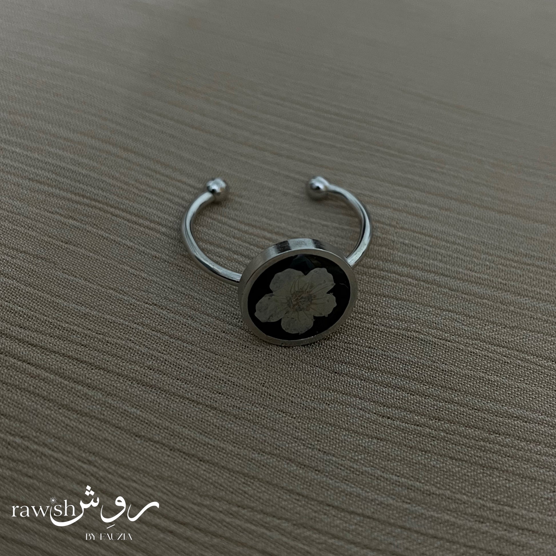 This elegant ring features an adjustable silver-colored band, making it a perfect fit for any finger. A single real flower preserved in clear resin stands out beautifully against the sleek black background, adding a charming and unique touch to your look. Its timeless design ensures it complements any outfit, making it an irresistible accessory to showcase your style.