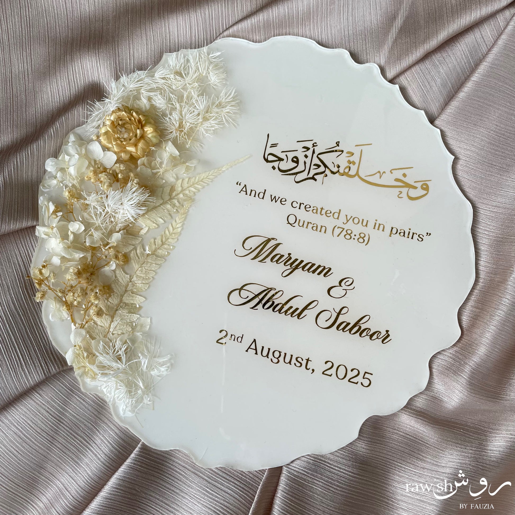 Elevate your wedding ceremony with our Customizable Wedding Tray. Made of resin and real preserved flowers, this plaque is a unique and cherished gift. Perfect for performing rasams in style and creating a lasting memory. Elevate your decor and cherish the moment forever with this must-have piece.