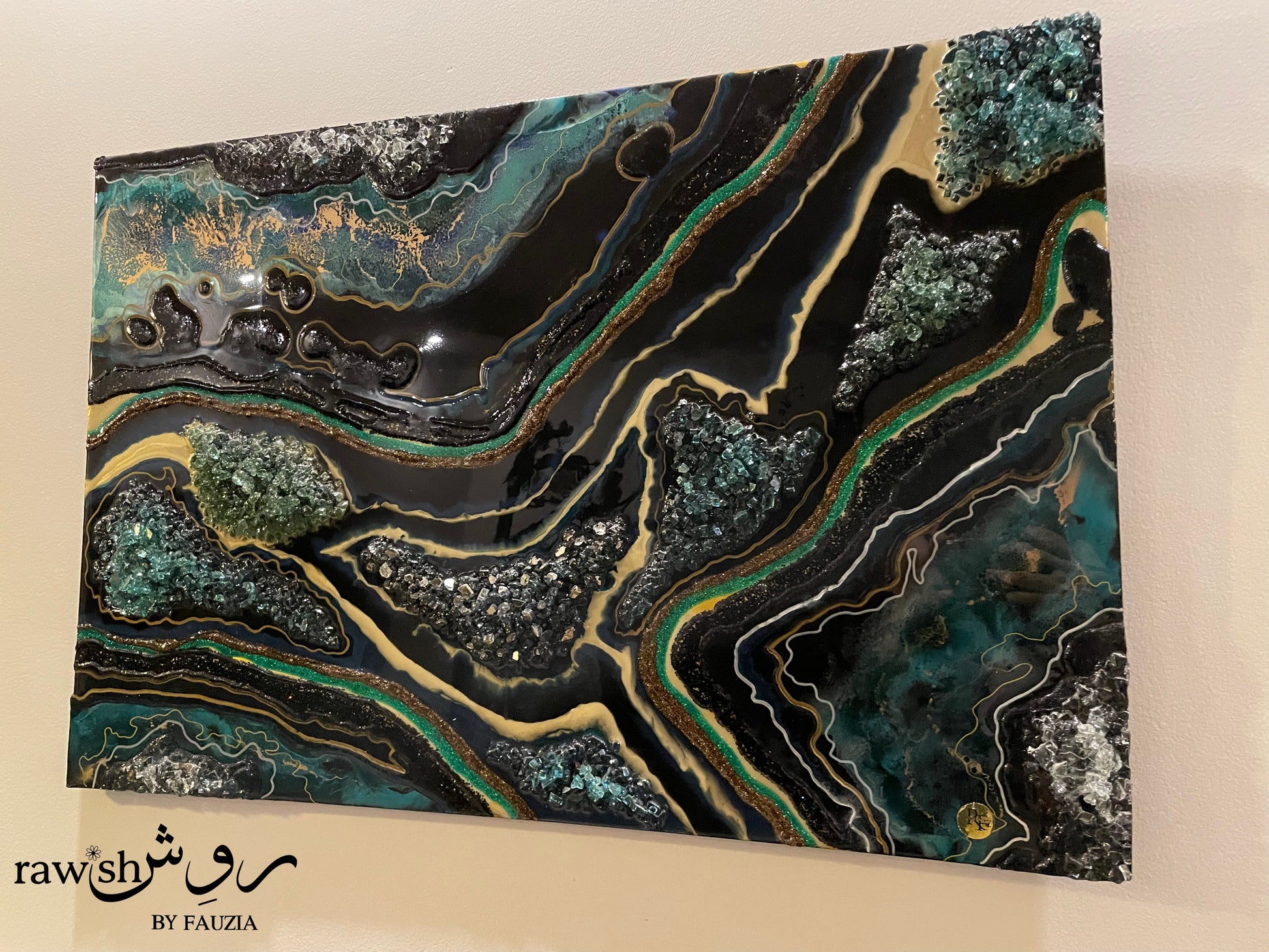Add a touch of sophistication to your living space with the Emerald Currents resin wall hanging. Featuring a sleek blend of ocean blue, royal green, gold, and black, this elegant piece brings vibrant color and dynamic energy to any room. Effortlessly express your unique style while enhancing your décor with this captivating artwork.