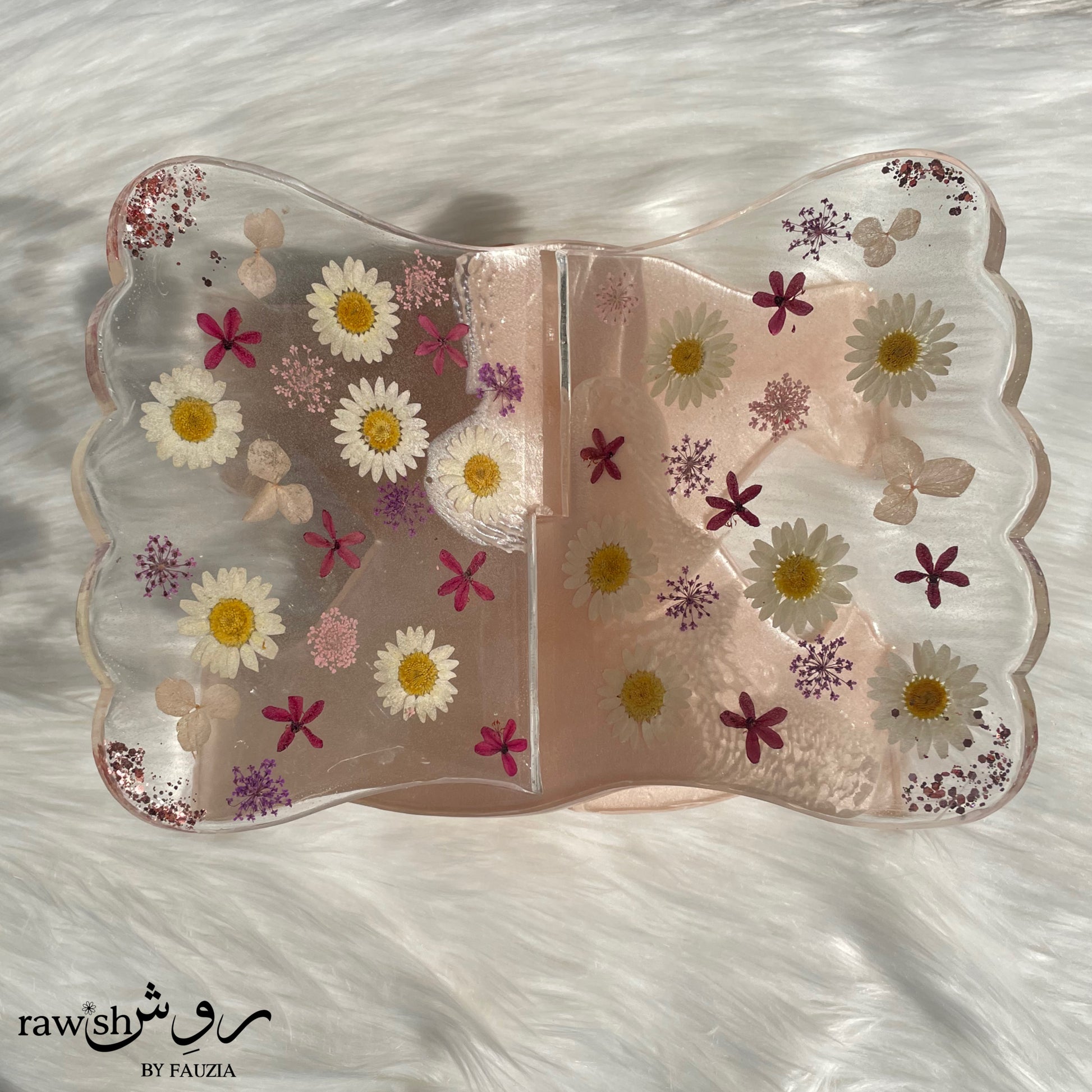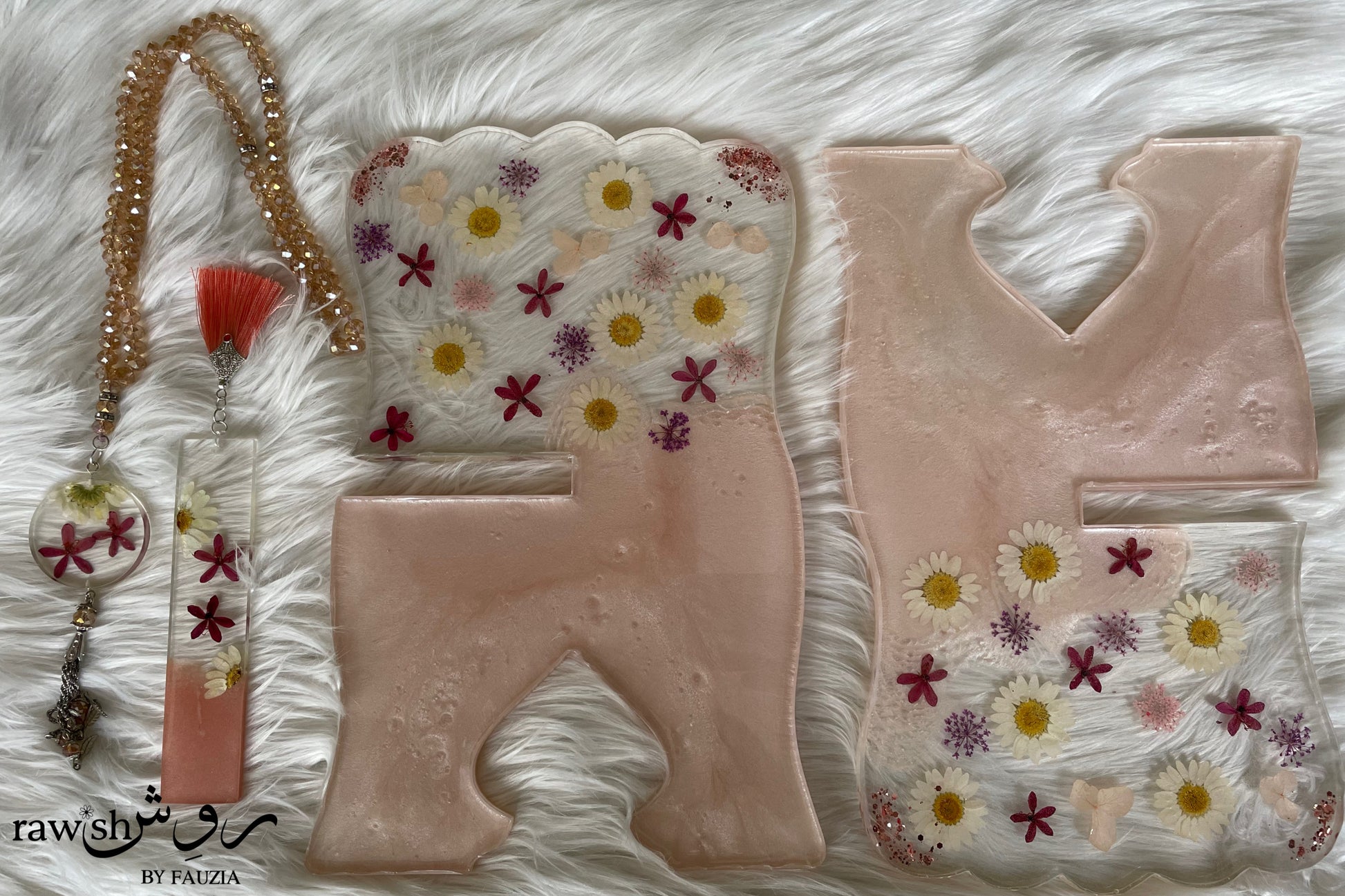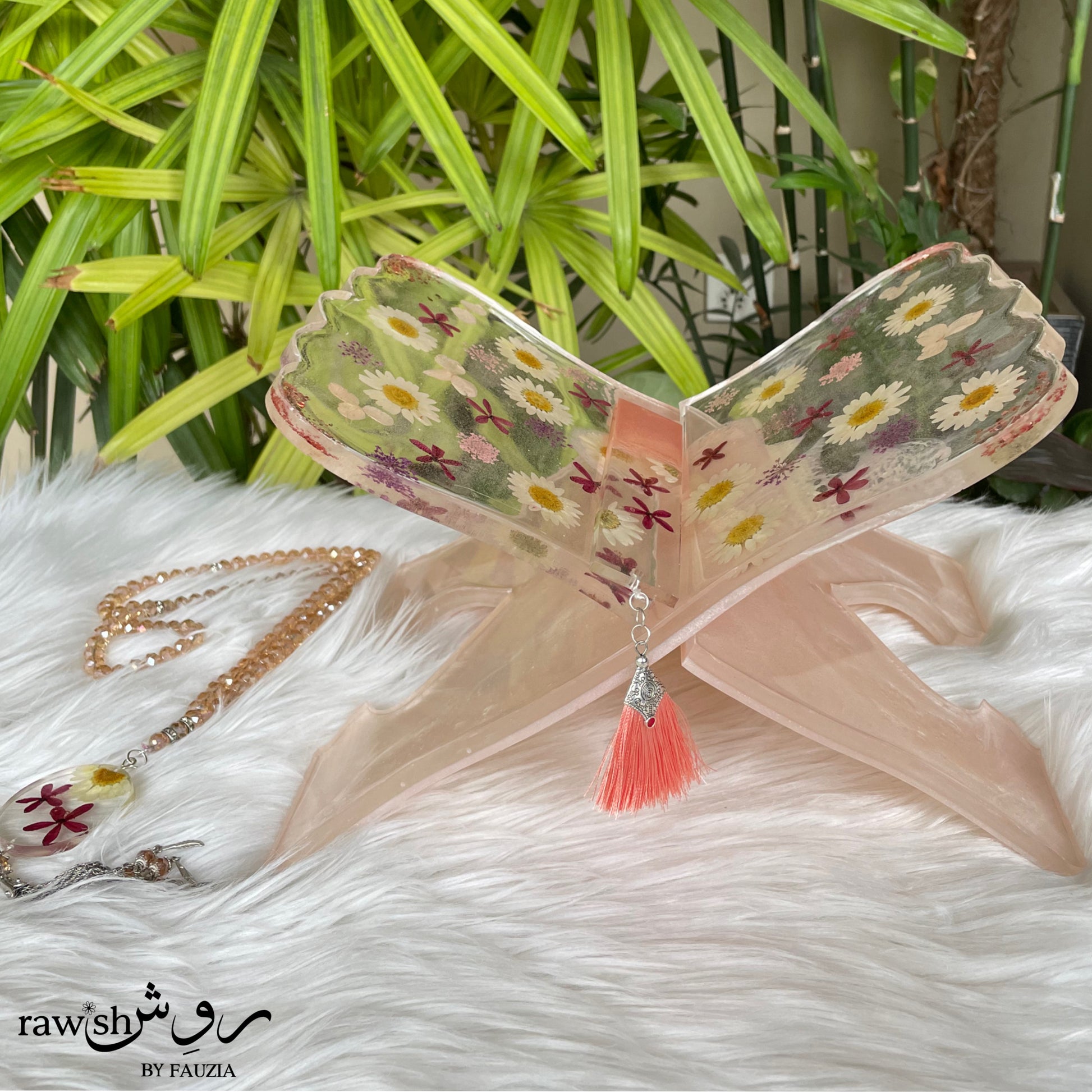 This pastel pink Floral Quran Stand beautifully holds the words of Allah while adding a touch of elegance with real flowers preserved in resin. It makes a thoughtful gift to inspire children beginning their Quran journey or to celebrate their completion. Ideal for weddings and special occasions, you can also elevate the gift by adding a matching bookmark and Tasbih. Customizations are available to create a truly meaningful and premium present.