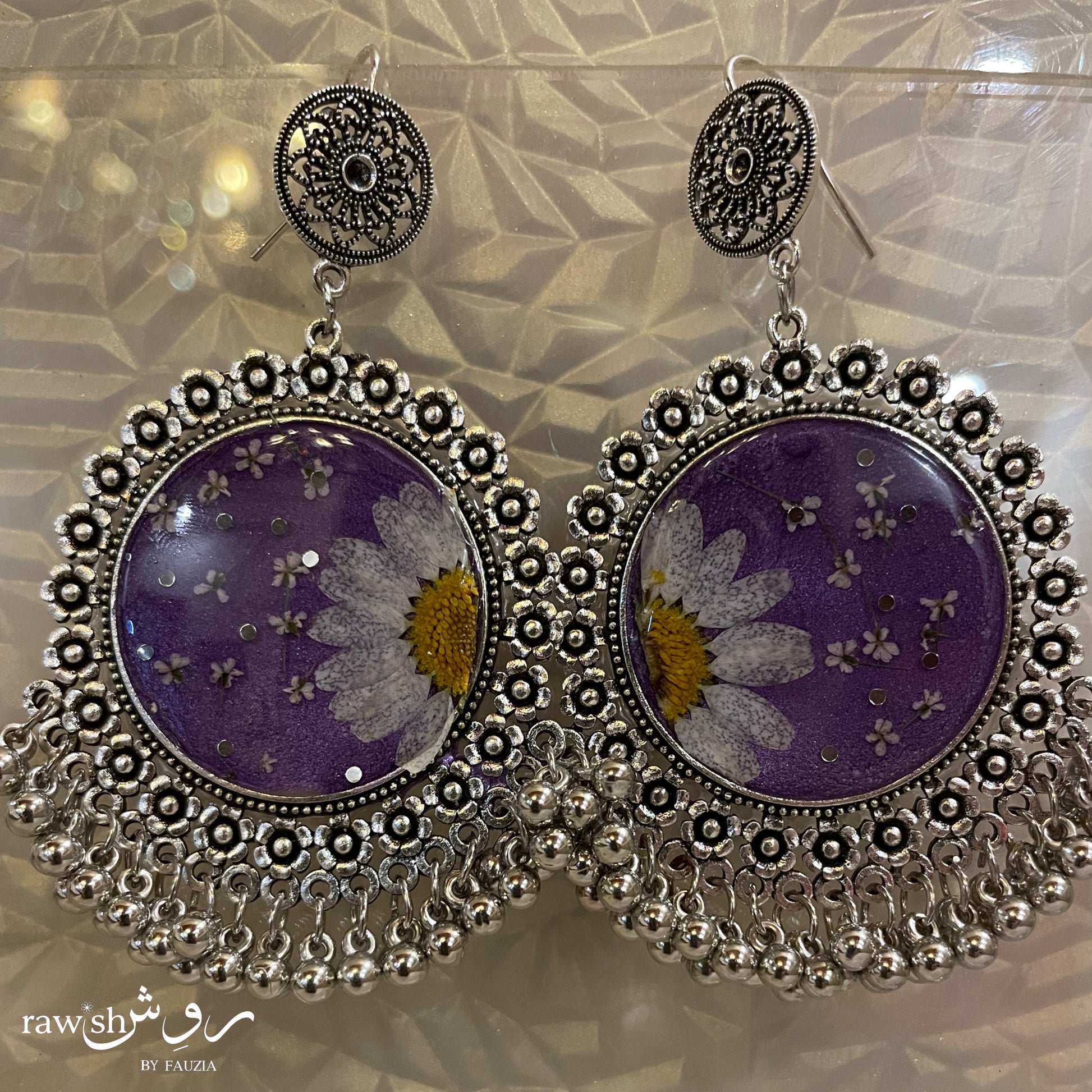 Elevate your style with these Purple Pastel Floral Jhumkas, featuring real daisies and flowers beautifully preserved in pastel purple resin. Their unique design draws attention and admiration, making them a perfect statement piece for your wardrobe or a thoughtful, heartfelt gift. Add a touch of natural elegance and charm to any outfit effortlessly.