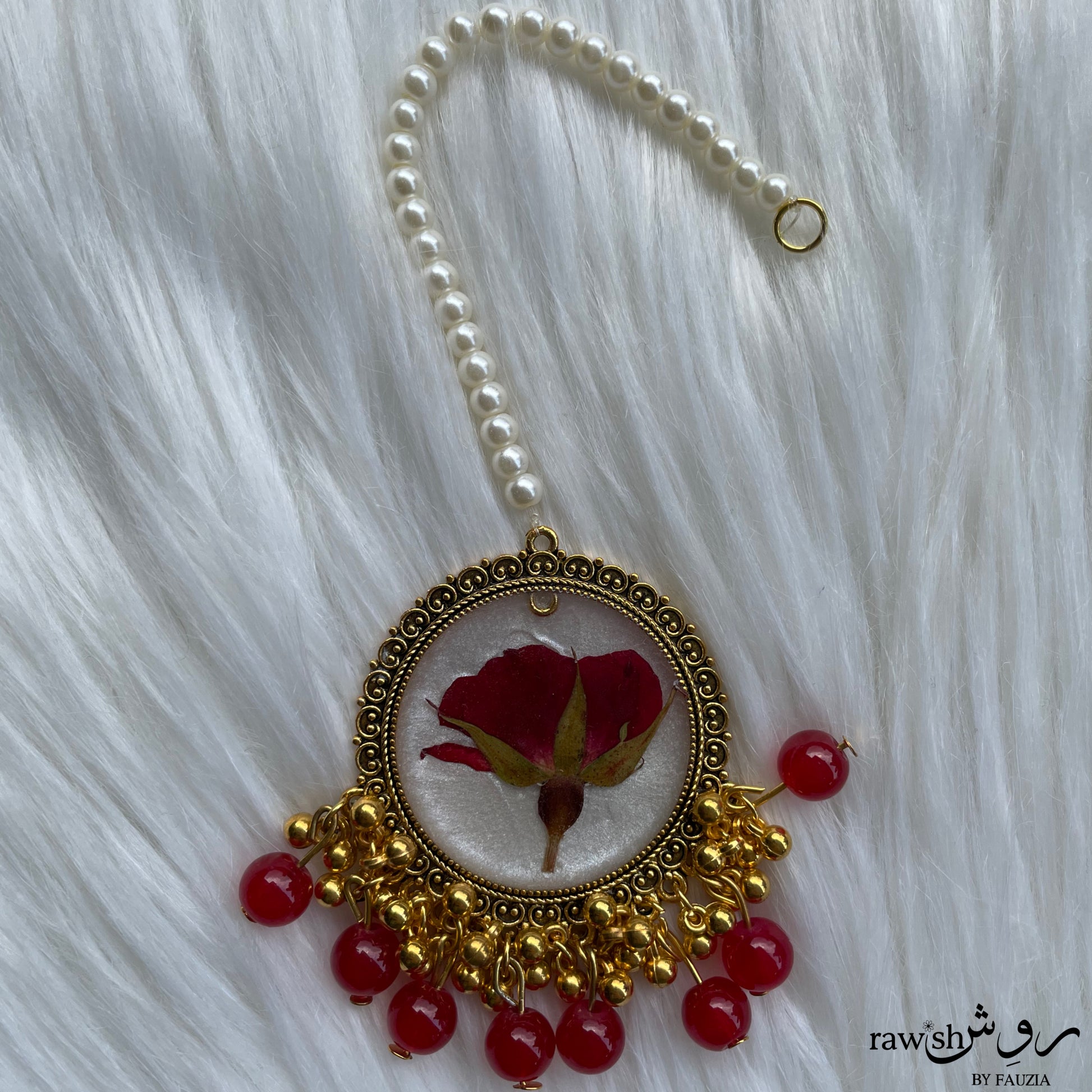 Elevate your style with our Red and White Floral Jhumkas and Tikka Set. Made with real petal flowers preserved in resin on a royal white background, this set will give you a stunning royal look. Perfect for weddings and special occasions, pair with any outfit for a show-stopping look.