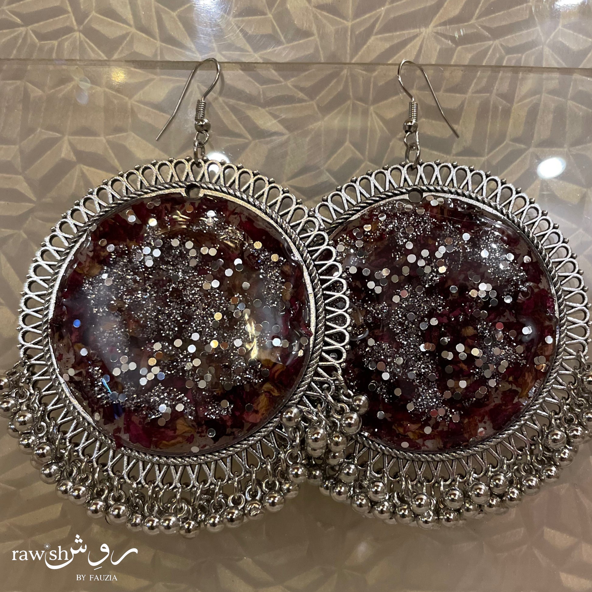 These Rose Glittery Silver Jhumkas feature real roses and shimmering silver glitter preserved in clear resin, creating a timeless accessory that elevates any look. Perfect as a meaningful gift or a personal keepsake, you can even preserve your own roses to cherish special memories. Add elegance and sentiment to your style with these unique jhumkas.